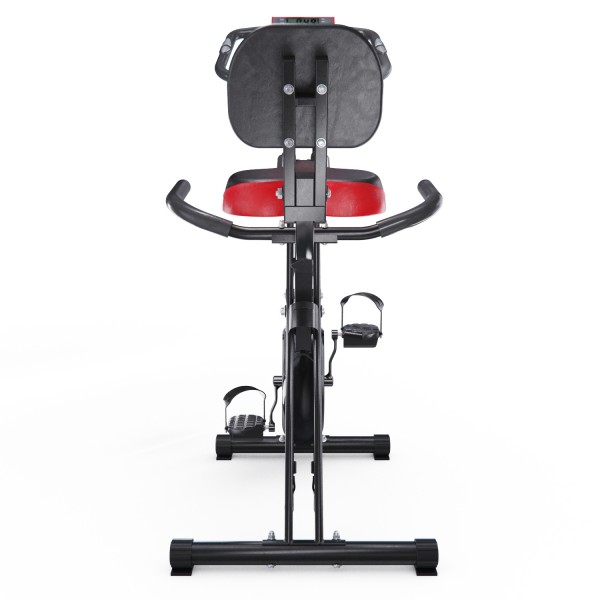 Велотренажёр DFC X-Bike MBB LS623X со спинкой подходит для пользователей весом до 120 килограмм. Он имеет складную конструкцию, что облегчает хранение и транспортировку. С магнитной системой нагрузки и 8 уровнями механической регулировки, вы можете подобрать оптимальный уровень нагрузки для вашей тренировки. Эспандеры для рук включены в комплектацию, чтобы вы могли проработать мышцы верхней части тела. На поручнях находятся сенсорные датчики пульса, которые позволяют контролировать ваш сердечный ритм во время тренировки. Монохромный ЖК-дисплей показывает время, скорость, пройденное расстояние, сожженные калории, одометр и ваш пульс. Для работы дисплея требуются две батарейки типа “AA” или “AAA”, которые не входят в комплект. Батарейки устанавливаются в задний отсек консоли.